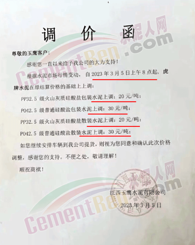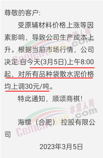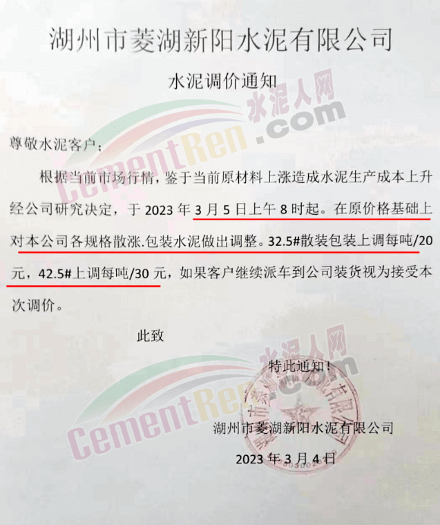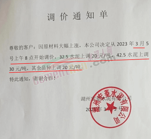 浙江湖州宏菱水泥通知,因原材料大幅上漲,公司決定從2023 年3月5號上午8點(diǎn)開始調(diào)價(jià),32.5水泥上調(diào) 20元/噸,42.5水泥上調(diào)30元/噸,其余品種上調(diào)20元/噸。