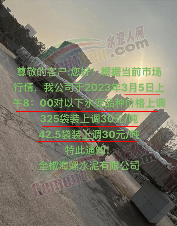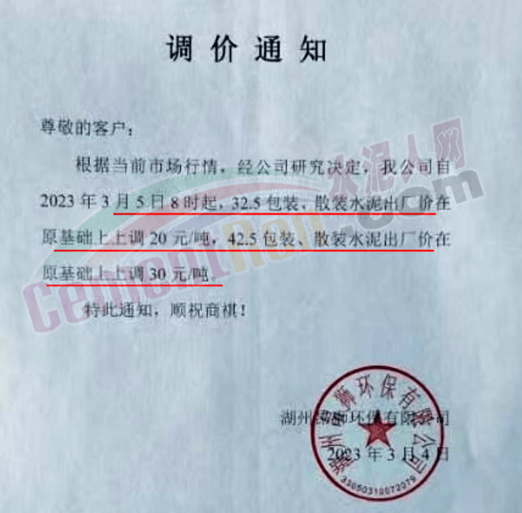 湖州高翔水泥有限公司通知,由于原材料漲價(jià),導(dǎo)致公司生產(chǎn)成本的不斷上升,本著互惠互利的原則,現(xiàn)經(jīng)公司研究決定,于2023年3月5日8時(shí)起,將對本公司生產(chǎn)的42.5(包裝)水泥在原來價(jià)格的基礎(chǔ)上上漲 30元/噸,325(包裝)水泥在原來價(jià)格的基礎(chǔ)上上漲20元/噸。