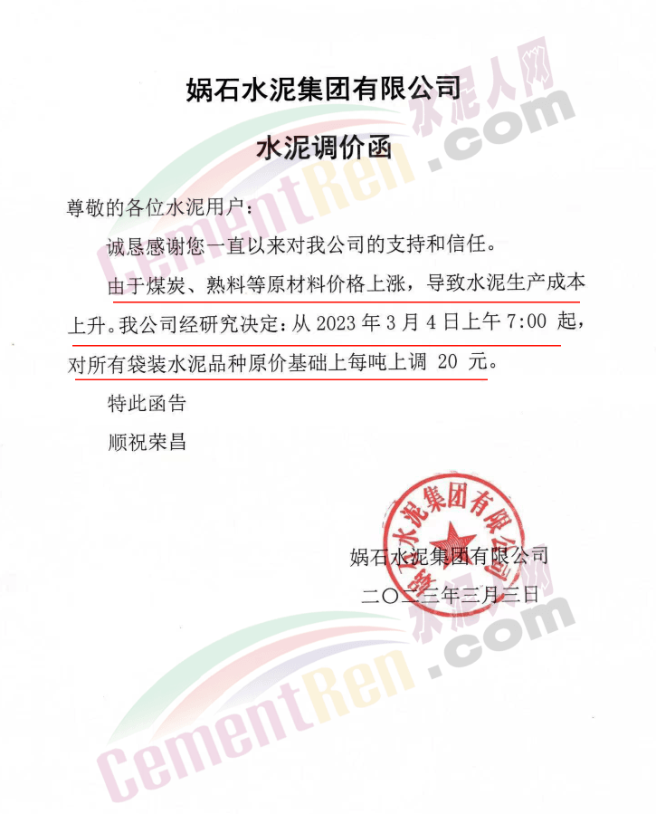 湖北媧石水泥集團有限公司通知,由于煤炭、熟料等原材料價格上漲,導致水泥生產(chǎn)成本上升,公司經(jīng)研究決定,從3月4日上午7時起,對所有袋裝水泥品種在原價基礎上上調20元/噸。