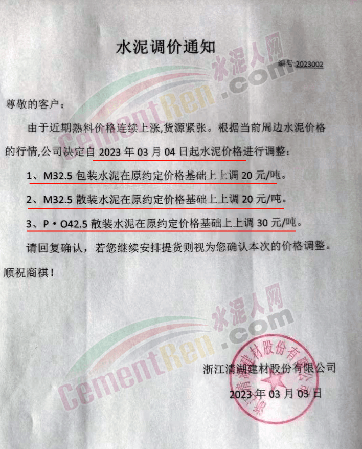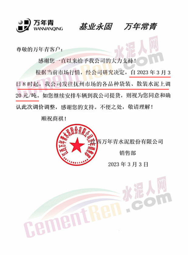江西萬年青水泥股份有限公司通知,根據(jù)當前市場行情,經(jīng)公司研究決定,自2023年3月3日8時起,公司發(fā)往撫州市場的各品種袋裝、散裝水泥上調20元/噸。