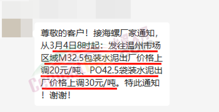 海螺經(jīng)銷商發(fā)消息稱,接海螺廠家通知,從3月4日8時起,發(fā)往溫州市場區(qū)域M32.5包裝水泥出廠價格上調20元/噸、P.O42.5袋裝水泥出廠價上調30元/噸。