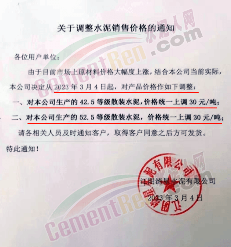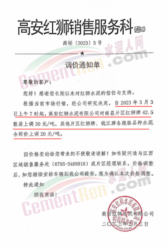 高安紅獅水泥銷售服務科通知,根據(jù)當前市場行情,經(jīng)公司研究決定,自2023年3月3日上午7時起,高安紅獅水泥有限公司對南昌片區(qū)紅獅牌42.5散裝上調30元/噸,其他片區(qū)紅獅牌、錢江牌各規(guī)格品種水泥合同價上調20元/噸。