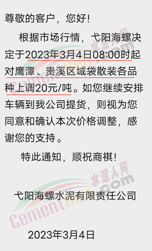 弋陽海螺通知,定于3月4日8時起對鷹潭、貴溪區(qū)域各品種水泥價格上調20元/噸。