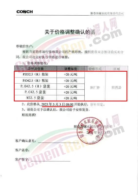 日前,陽春海螺水泥有限責任公司通知,從3月3日8時起各標號水泥陽西縣區(qū)域出廠價上調20元/噸。