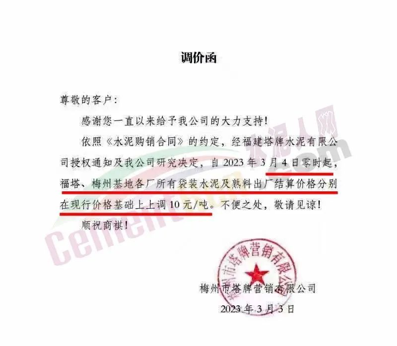 梅州市塔牌營銷有限公司通知,自3月4日零時起,福塔、梅州基地各廠所有袋裝水泥及熟料出廠結算價格上調10元/噸。