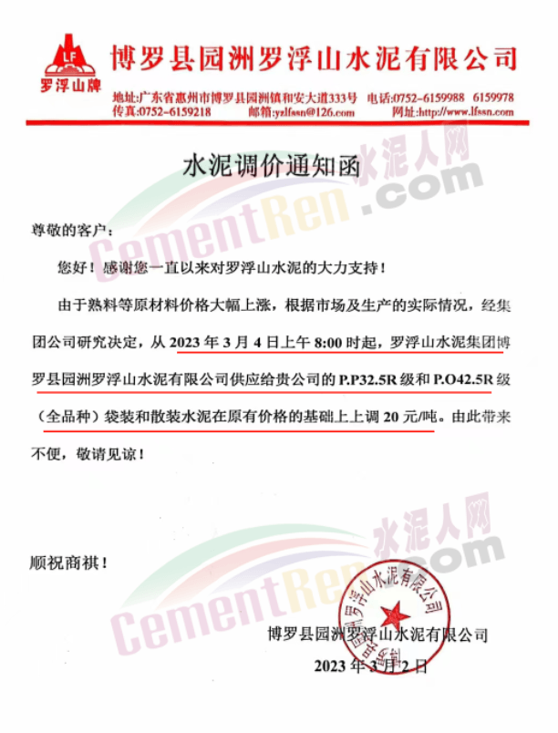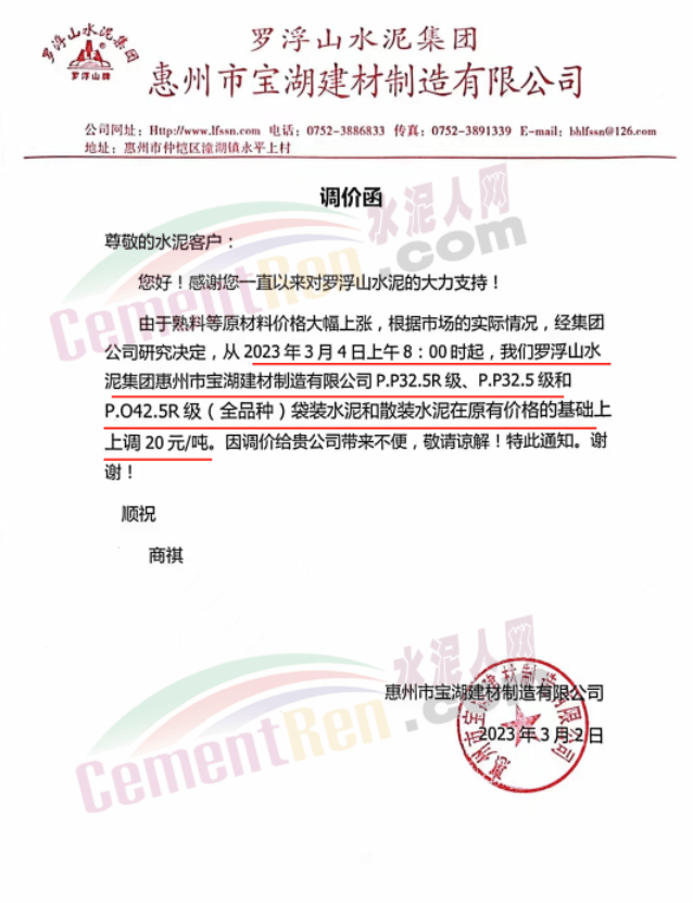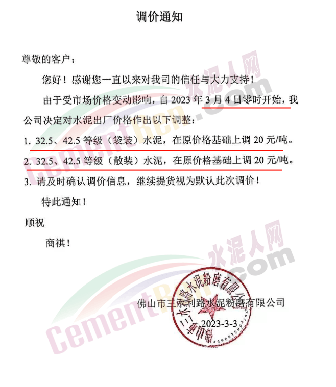 佛山市三水利路水泥粉磨有限公司通知,3月4日零時開始各標號水泥上調20元/噸。