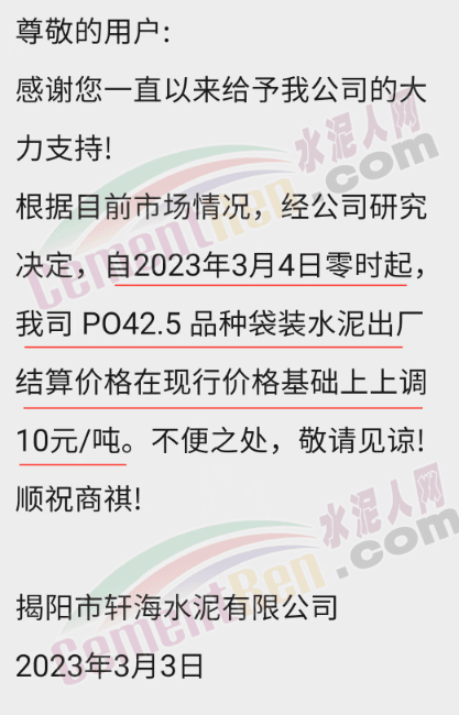 揭陽市軒海水泥有限公司通知,3月4日零時起,P.O42.5袋裝水泥出廠價上調10元/噸。
