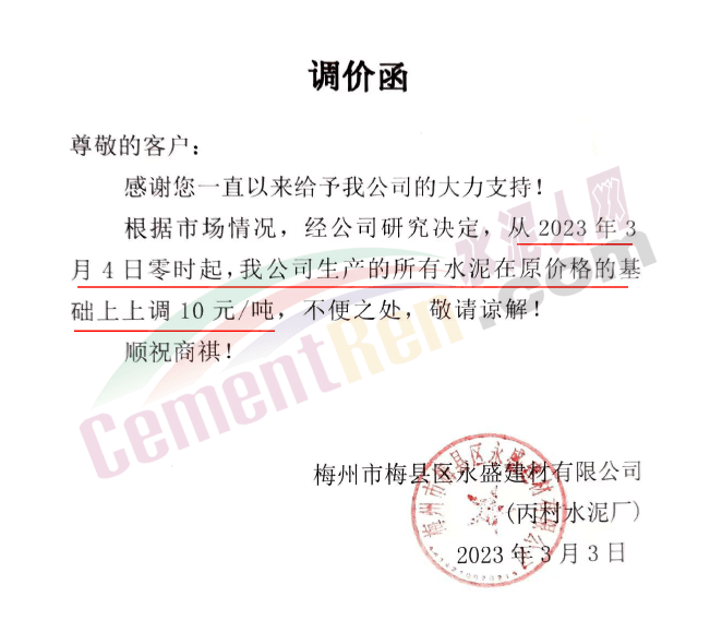 梅州市梅縣區(qū)永盛建材有限公司通知,3月4日零時起,公司生產(chǎn)的所有水泥在原價基礎上上調10元/噸。
