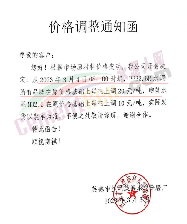 英德市星燁旋窯水泥粉磨廠通知,3月4日8時起,各標號水泥上調10-20元/噸。