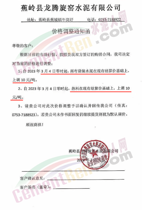 蕉嶺龍騰旋窯水泥通知,3月4日零時起,水泥及熟料價格上調10元/噸。