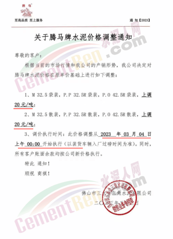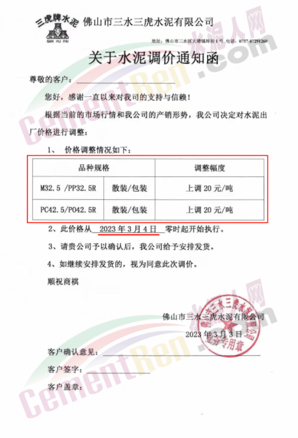 佛山市三水三虎水泥通知,3月4日零時起各標號水泥上調20元/噸。