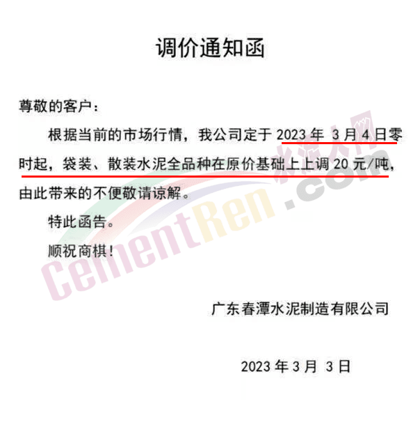 廣東春潭水泥制造有限公司通知,3月4日零時起,全品種水泥在原基礎上上調20元/噸。