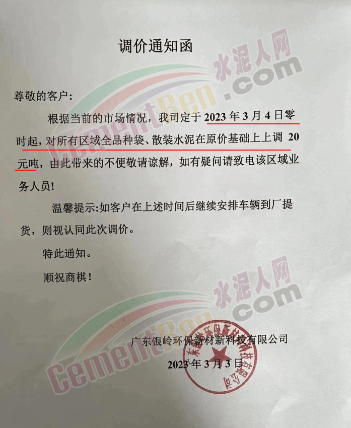 廣東銀嶺環(huán)保新材料科技有限公司通知,3月4日對全區(qū)域水泥價格上調20元/噸。