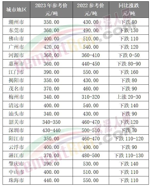 從上述數(shù)據(jù)可見江門區(qū)域2022年3月初報價在550元/噸,目前參考報價還不到400元/噸。梅州市場上年同期報價在310-320元/噸左右,今年3月初報價340元/噸左右,若考慮成本上漲因素,該報價與上年同期仍有差距。