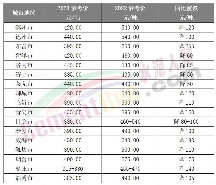 水泥人網(wǎng)信息中心數(shù)據(jù)顯示,山東東營水泥價格較上年同期大跌255元/噸,威海、煙臺水泥價格跌190元/噸、170元/噸;日照今年3月初較上年同期報價下跌80-160元/噸,棗莊區(qū)域水泥價格也下跌了140元/噸左右。