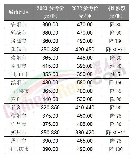 河南區(qū)域16個城市地區(qū),僅南陽和平頂山市水泥價格較上年同期小幅上漲。其他14個區(qū)域均有不同幅度的下跌。其中濮陽市上年同期報價在580元/噸,今年3月初報價430元/噸左右,下跌達150元/噸,濟源市價格下跌130元/噸。新鄉(xiāng)區(qū)域下跌90元/噸,鄭州區(qū)域下跌30-40元/噸。