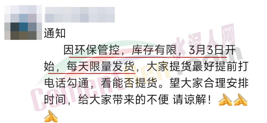 日前,山西某水泥企業(yè)發(fā)通知稱,因環(huán)保管控,庫(kù)存有限,3月3日開始,每天限量發(fā)貨,請(qǐng)大家提時(shí)提前預(yù)約。