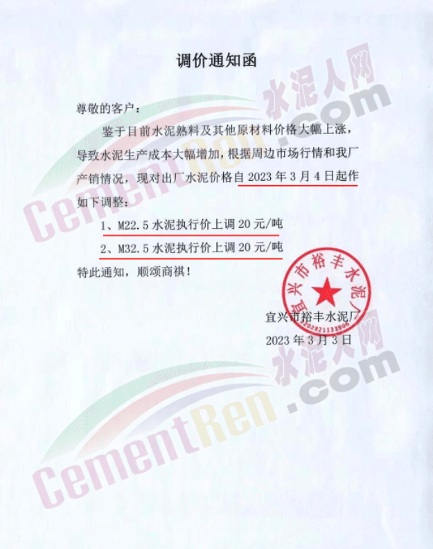 宜興市裕豐水泥廠通知,鑒于目前水泥熟料及其他原材料價格大幅上漲,導(dǎo)致水泥生產(chǎn)成本大幅增加,根據(jù)周邊市場行情和工廠產(chǎn)銷情況,自2023年3月4日M22.5水泥執(zhí)行價上調(diào)20元/噸,M32.5水泥執(zhí)行價上調(diào)20元/噸。