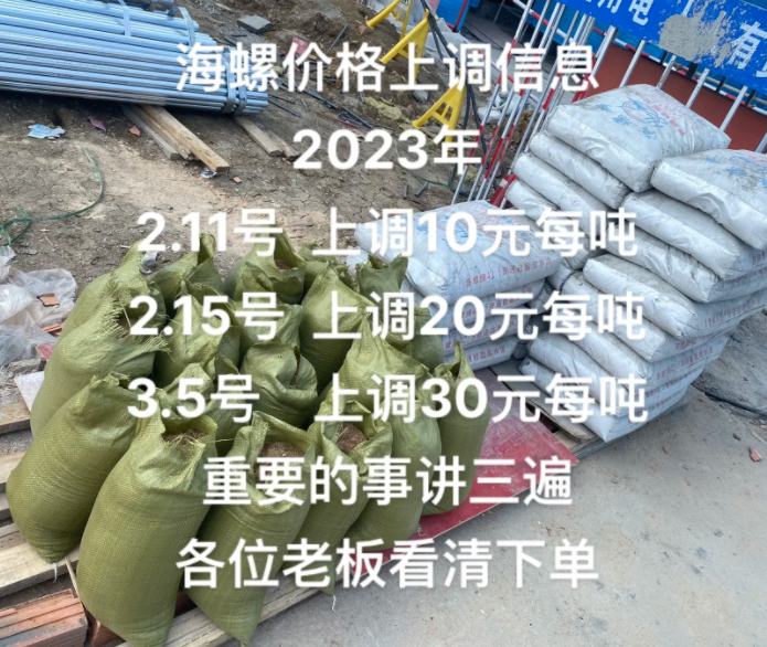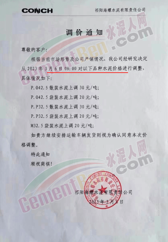 全椒海螺水泥有限公司通知,根據(jù)當(dāng)前市場行情,公司于2023年3月5日上午8時起對325袋裝上調(diào)30元/噸,42.5袋裝上調(diào)30元/噸。