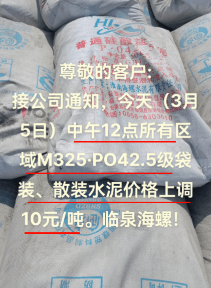 3月5日前后,海螺水泥經(jīng)銷商通知,發(fā)往溫州市場水泥價格上調(diào)20-30元/噸,其中M32.5包裝水泥上調(diào)20元/噸、P.O42.5袋裝水泥上調(diào)30元/噸。