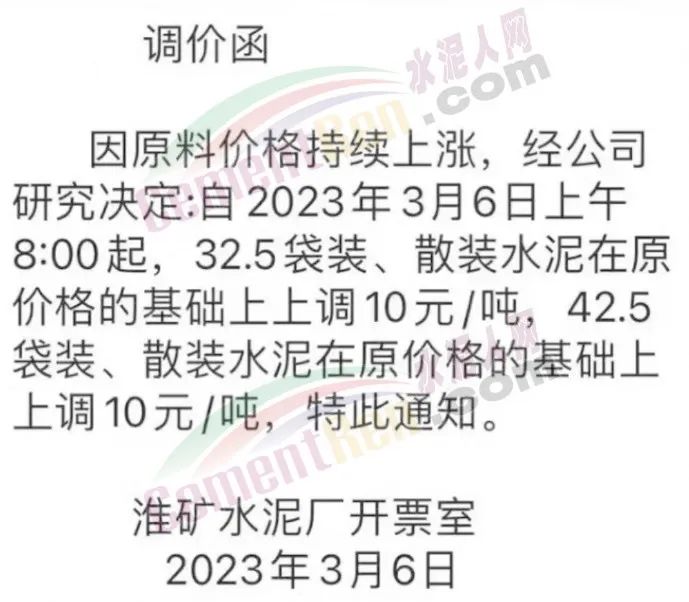淮南市盤龍水泥、淮南禹山水泥公司、淮礦水泥廠、沿淮水泥廠通知,自3月6日起,水泥價格上調(diào)10元/噸。
