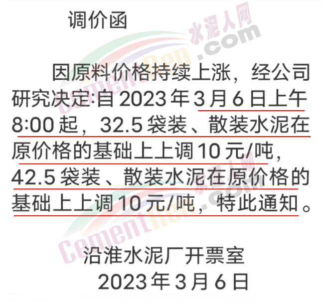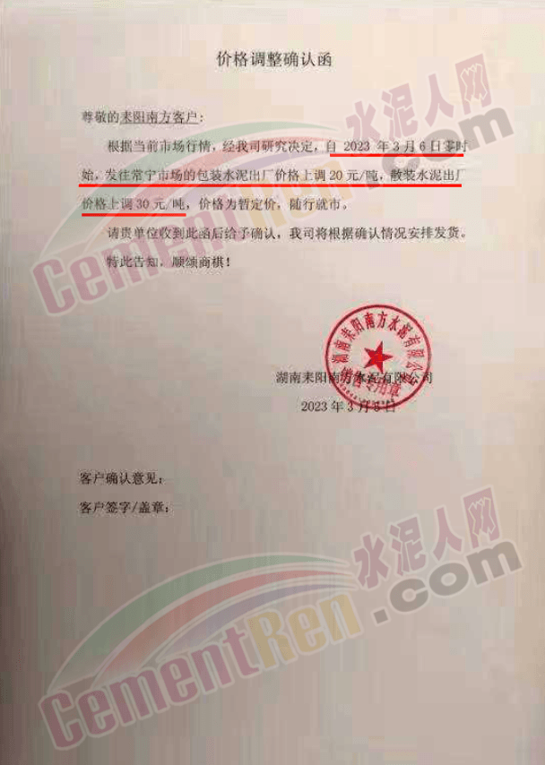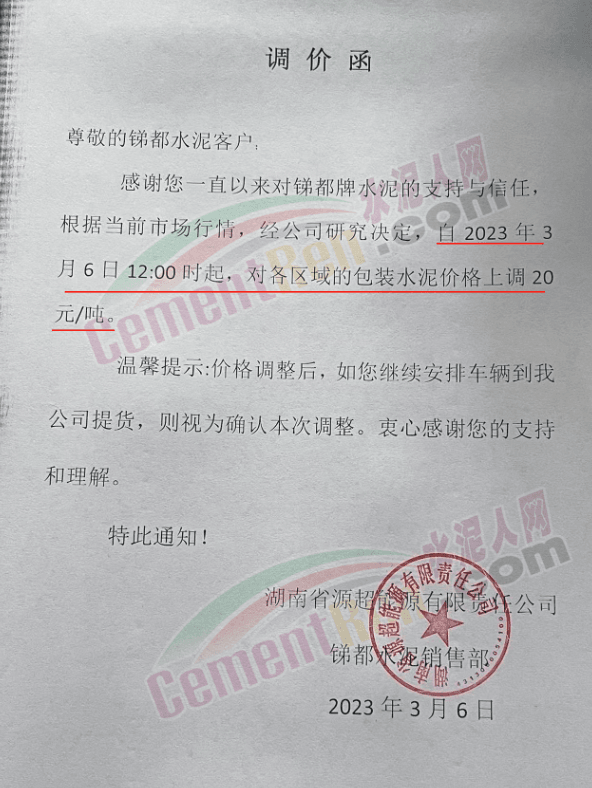 湖南省源超能源有限責(zé)任公司銻都水泥銷售部通知,根據(jù)當(dāng)前市場行情,經(jīng)公司研究決定,自2023年3月6日12:00時起,對各區(qū)域的包裝水泥價格上調(diào)20元/噸。
