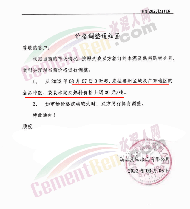 華潤水泥旗下湖南良田水泥通知,自3月7日0時起,發(fā)往郴州區(qū)域及廣東地區(qū)的水泥及熟料價格上調(diào)30元/噸。