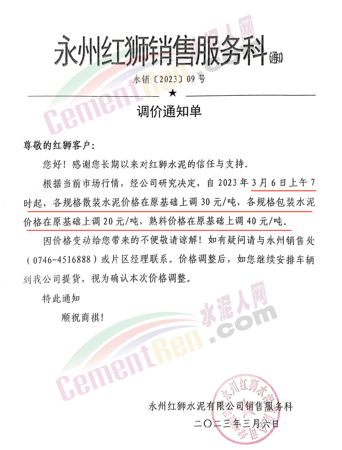 衡陽紅獅銷售服務(wù)科通知,根據(jù)當(dāng)前市場行情,經(jīng)公司研究決定,自2023年3月6日上午7時起各規(guī)格品牌包裝水泥價格上調(diào)20元/噸、各規(guī)格散裝水泥上調(diào)30元/噸,熟料上調(diào)40元/噸。