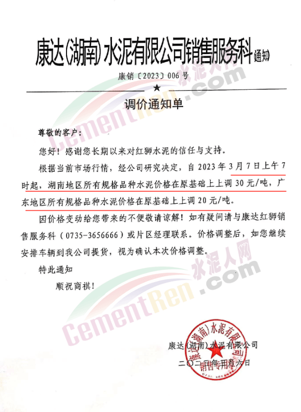 康達(dá)(湖南)水泥有限公司銷售服務(wù)科通知,根據(jù)當(dāng)前市場行情,經(jīng)公司研究決定,自2023年3月7日上午7時起,湖南地區(qū)所有規(guī)格品種水泥價格在原基礎(chǔ)上上調(diào)30元/噸,廣東地區(qū)所有規(guī)格品種水泥價格在原基礎(chǔ)上上調(diào)20元/噸。