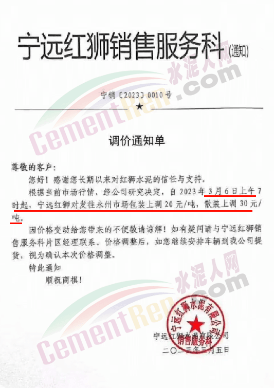 寧遠(yuǎn)紅獅水泥銷售服務(wù)科通知,3月6日上午7時起,對發(fā)往永州市場水泥價格上調(diào)20-30元/噸。