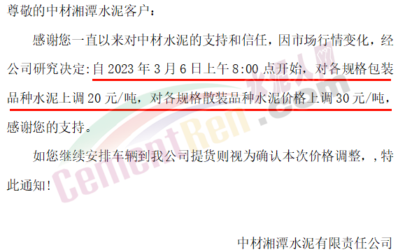 華新水泥(郴州)有限公司通知,自3月7日8時起,對湖南區(qū)域所有包裝、散裝供貨產(chǎn)品價格上調(diào)30元/噸。