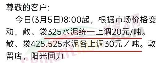 日前,河南區(qū)域陽光同力通知3月5日8時起,根據(jù)市場價格變動,散、袋32.5水泥統(tǒng)一上調(diào)20元/噸。散、袋42.5、52.5水泥各上調(diào)30元/噸。