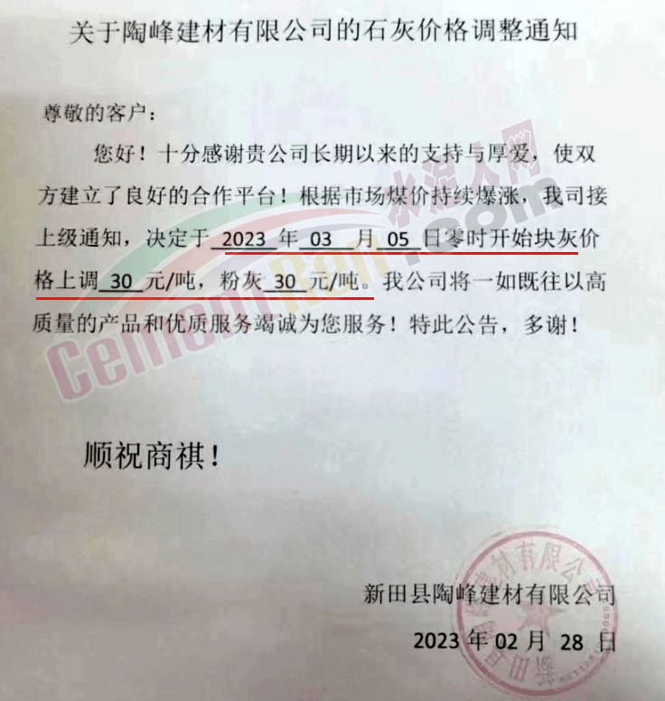 新田縣陶峰建材有限公司通知,定于2023年3月5日0時開始塊灰價格上調(diào)30元/噸,粉灰30元/噸。