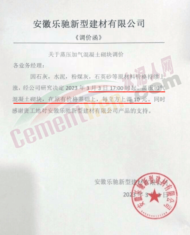 安徽樂馳新型建材有限公司通知,因石灰,水泥,粉煤灰,石英砂等原材料價格持續(xù)上漲,經(jīng)公司研究決定2023年3月3日17時起,蒸壓加氣混凝土砌塊,在原有價格基礎(chǔ)上每立方上調(diào)10元。