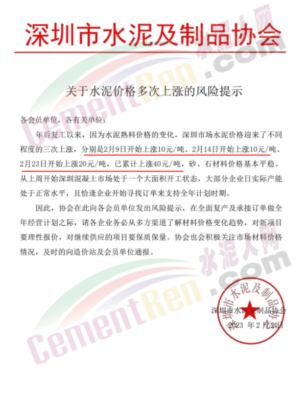 深圳市水泥及制品協(xié)會發(fā)出提示函稱,自年后復(fù)工以來,因為水泥熟料價格的變化,深圳市場水泥價格迎來了不同程度的三次上漲,分別是2月9日開始上漲10元/噸、2月14日開始上漲10元/噸、2月23日開始上漲20元/噸,已累計上漲40元/噸,砂、石材料價格基本平穩(wěn)。協(xié)會在此向各會員單位發(fā)出風(fēng)險提示,在全面復(fù)產(chǎn)及承接訂單做全年經(jīng)營計劃之際,請各企業(yè)務(wù)必從多方渠道了解材料價格變化趨勢,對新項目要理性報價,采購穩(wěn)定、合格的原材料以保障混凝土的供應(yīng),同時確?;炷临|(zhì)量。
