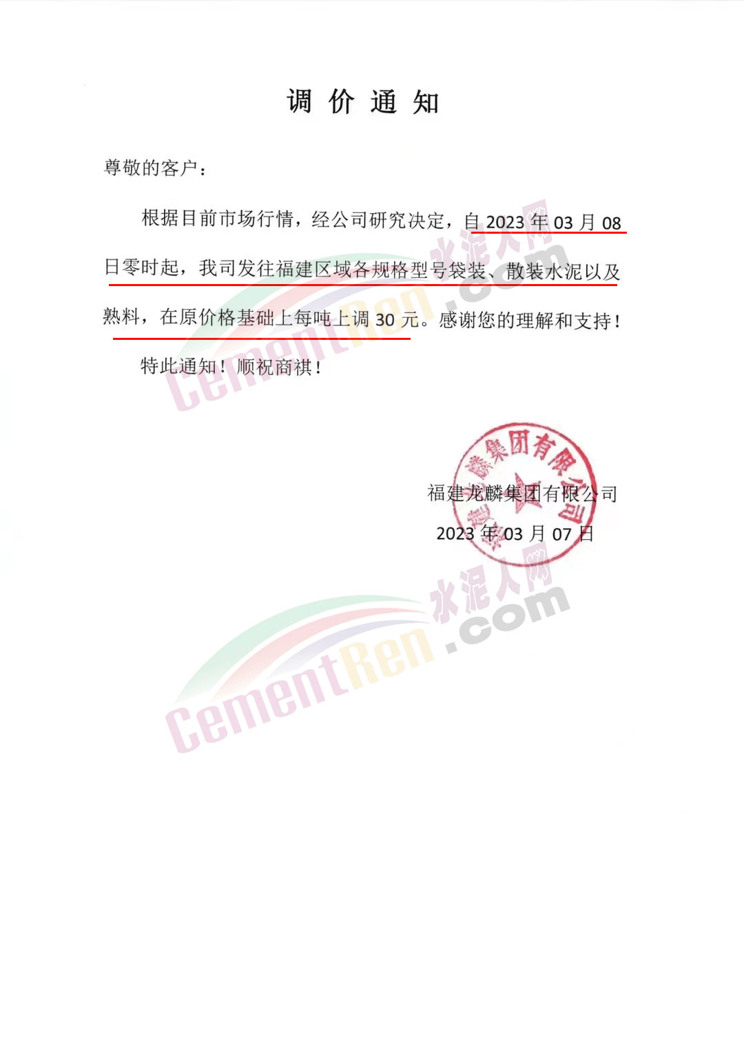 福建龍麟集團(tuán)有限公司通知,3月8日零時起,發(fā)往福建區(qū)域各規(guī)格型號袋裝、散裝水泥以及熟料在原價基礎(chǔ)上上調(diào)30元/噸。