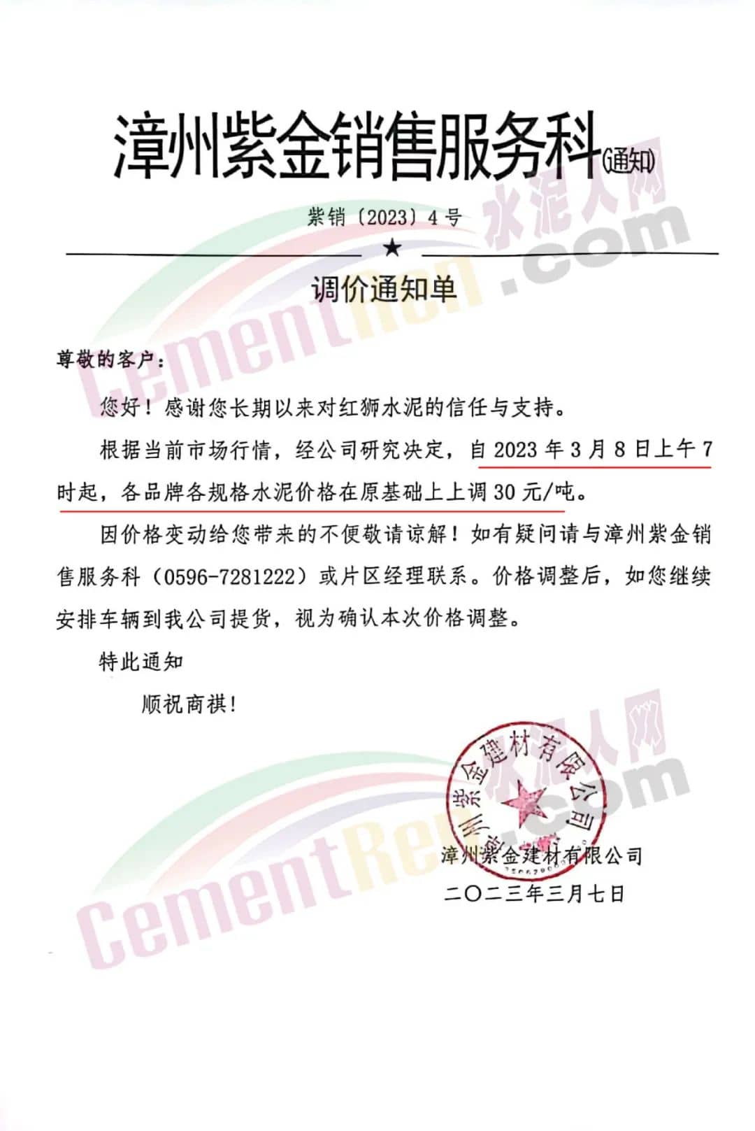 漳州紫金建材有限公司通知,自3月8日上午7時起,各品牌各規(guī)格水泥價格在原基礎(chǔ)上上調(diào)30元/噸。