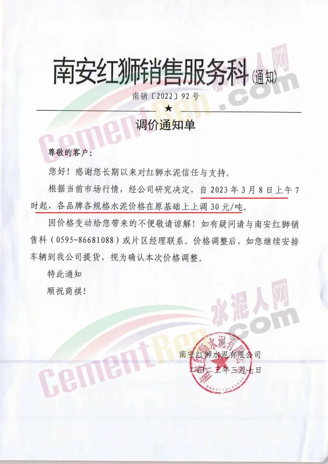 南安紅獅銷售服務(wù)科通知,3月8日上午7時起,各品牌各規(guī)格水泥價格在原基礎(chǔ)上上調(diào)30元/噸。