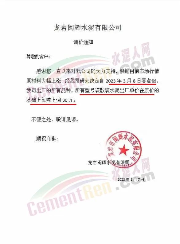 龍巖閩輝水泥有限公司通知,根據(jù)當(dāng)前市場行情 ,原材料大幅上漲,經(jīng)公司研究決定自3月8日零點(diǎn)起,公司出廠的所有品種,所有型號袋散裝水泥出廠單價在原價基礎(chǔ)上每噸上調(diào)30元。