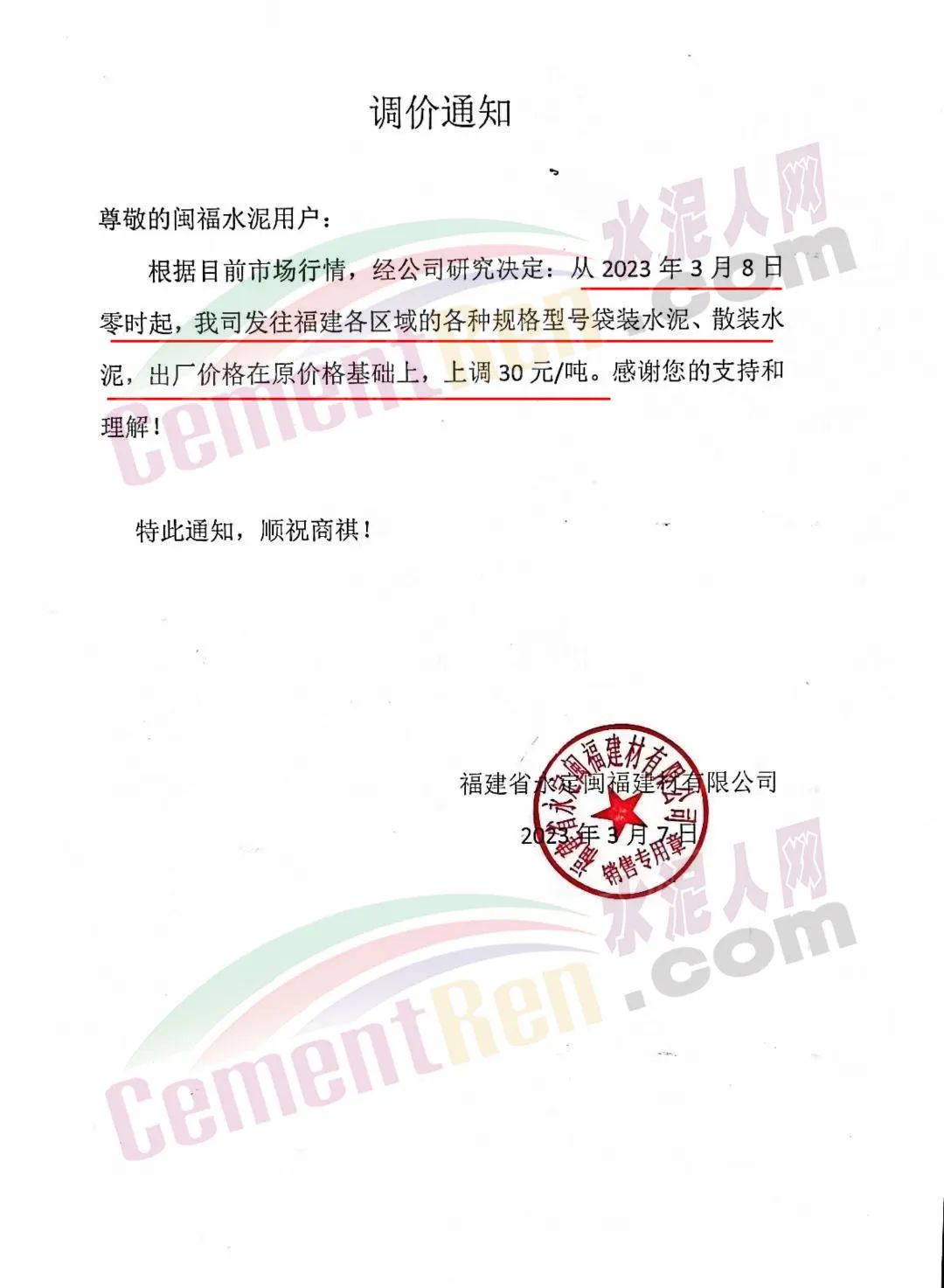 福建省永定閩福建材有限公司通知,3月8日零時起,公司發(fā)往福建各區(qū)域的各規(guī)格型號袋裝水泥、散裝水泥出廠價上調(diào)30元/噸。