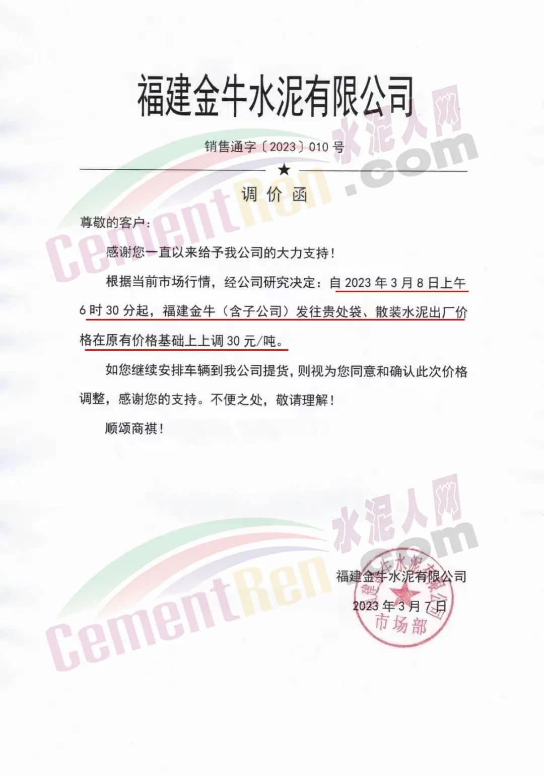 福建金牛水泥有限公司通知,自3月8日上午6時30分起,水泥出廠價上調(diào)30元/噸。