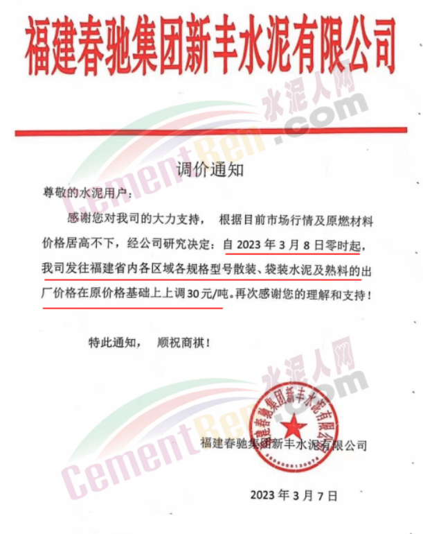 福建春馳集團(tuán)新豐水泥有限公司通知,根據(jù)目前市場行情 及原燃材料價格居高不下,經(jīng)公司研究決定,自3月8日零時起,公司發(fā)往福建省內(nèi)各區(qū)域各規(guī)格型號散裝、袋裝水泥及熟料的出廠價在原價基礎(chǔ)上上調(diào)30元/噸。
