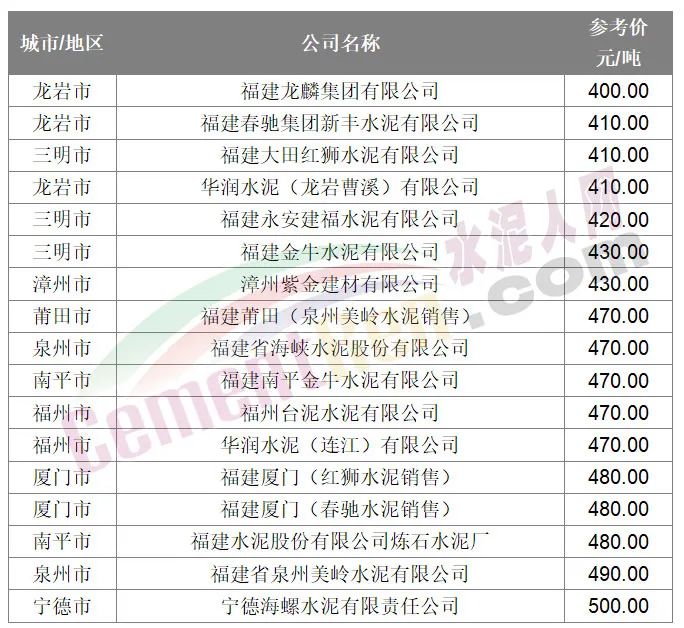 從水泥人網(wǎng)信息中心參考報價可見,本次調(diào)價前,福建市場水泥報價在400-500元/噸之間。