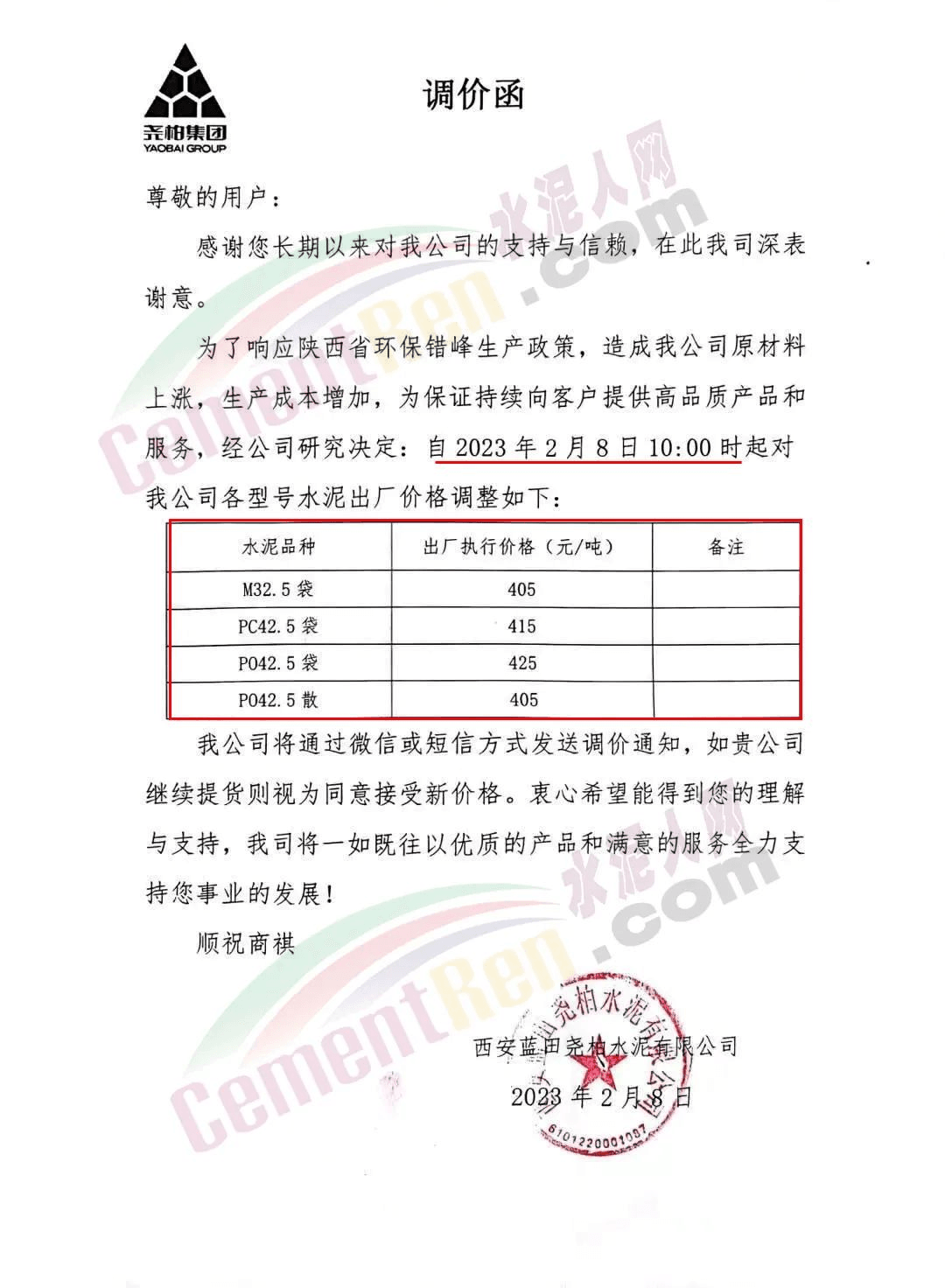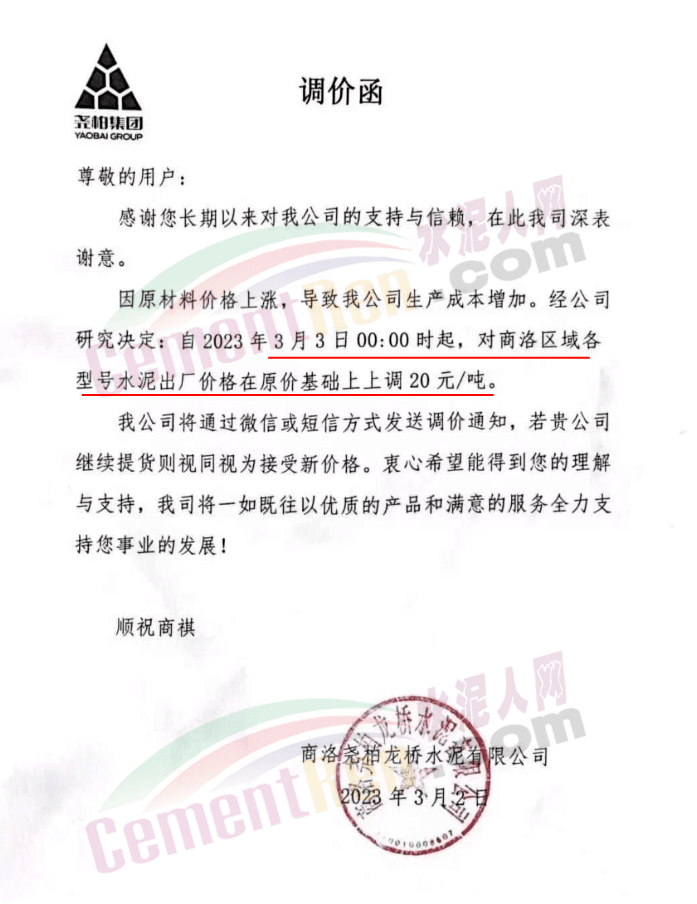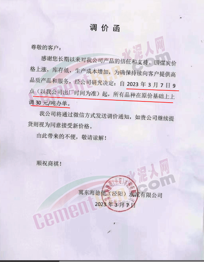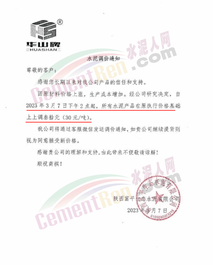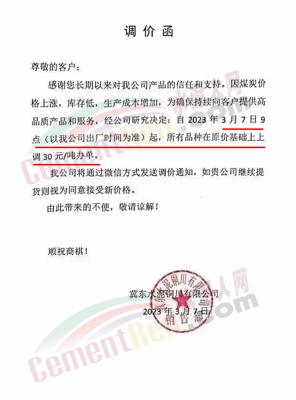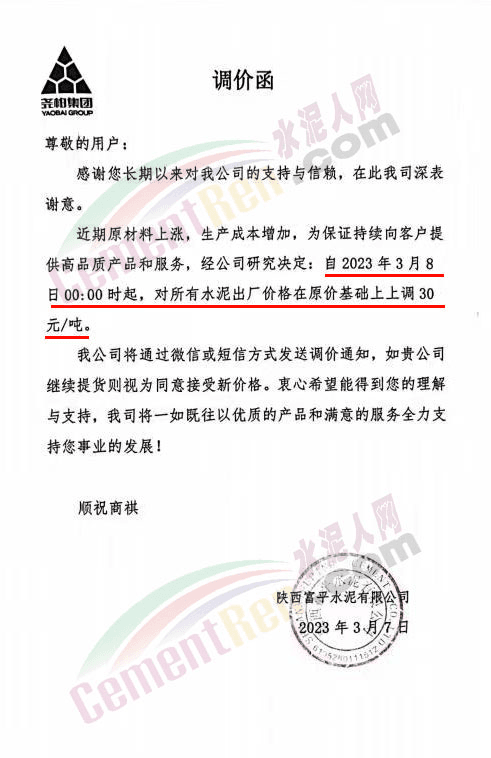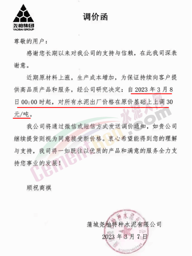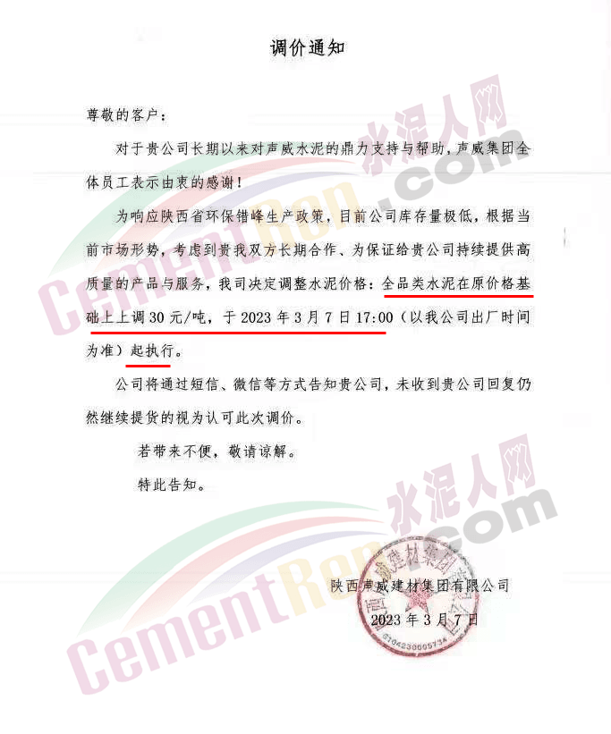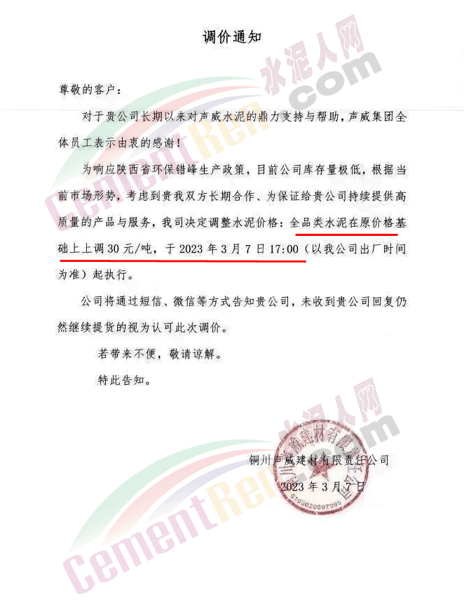 陜西聲威建材集團(tuán)有限公司、銅川聲威建材有限責(zé)任公司通知稱,為響應(yīng)陜西省環(huán)保錯峰生產(chǎn)政策,目前公司庫存量極低,根據(jù)當(dāng)前市場形勢,于2023年3月7日17時起公司全品類水泥在原價基礎(chǔ)上上調(diào)30元/噸。
