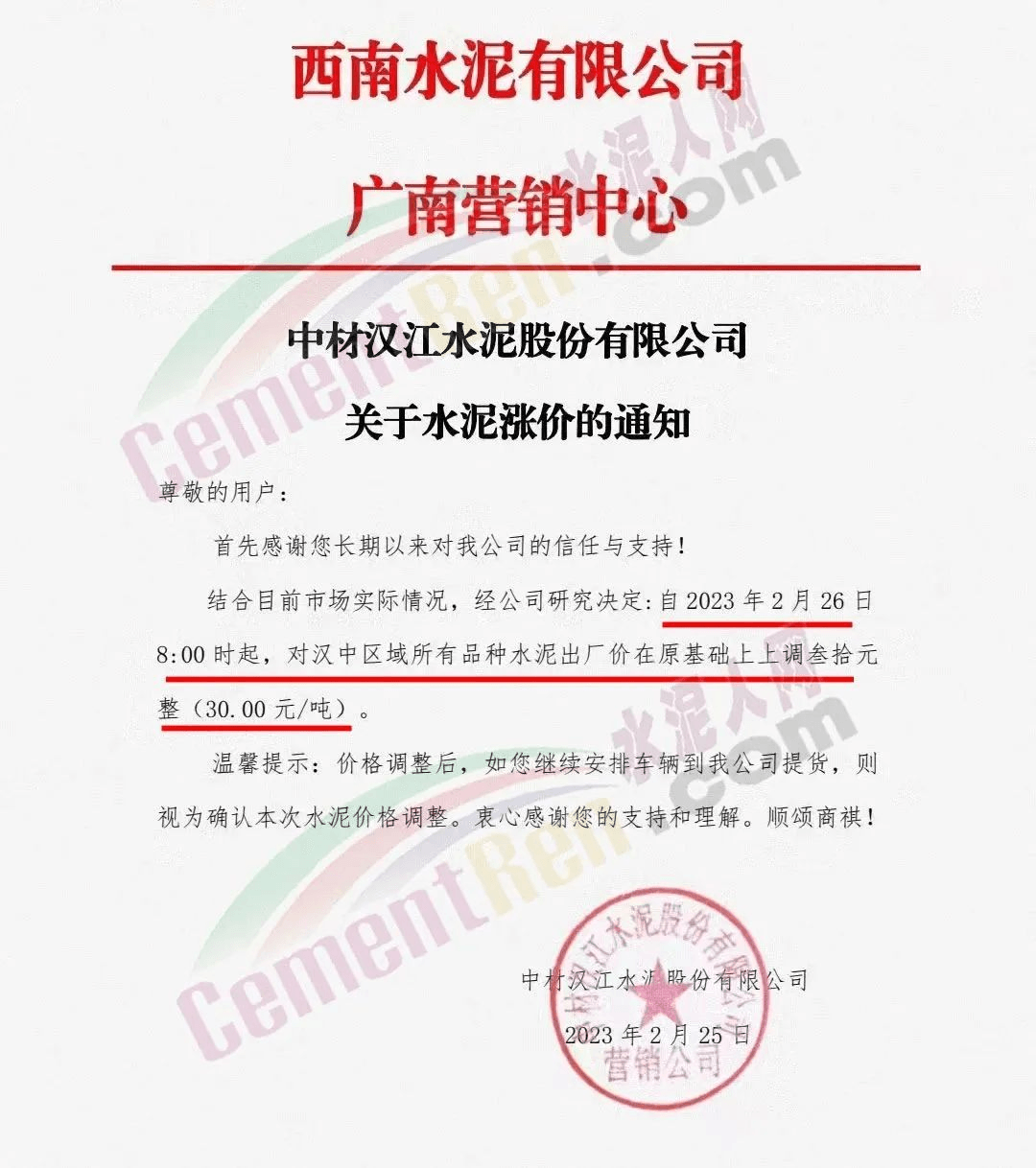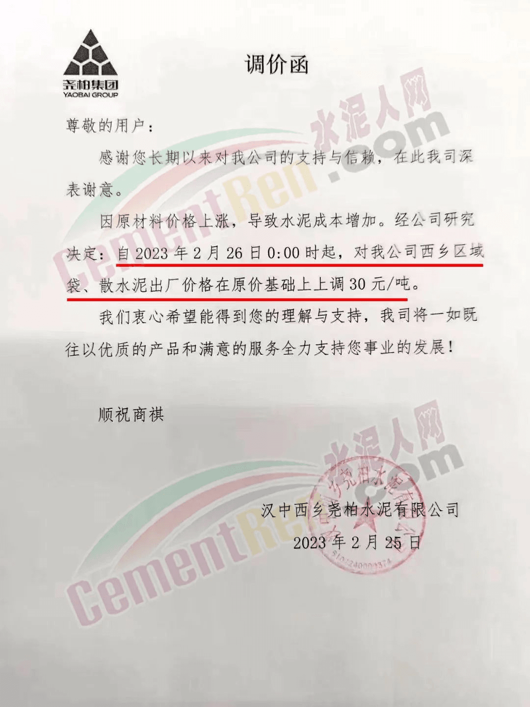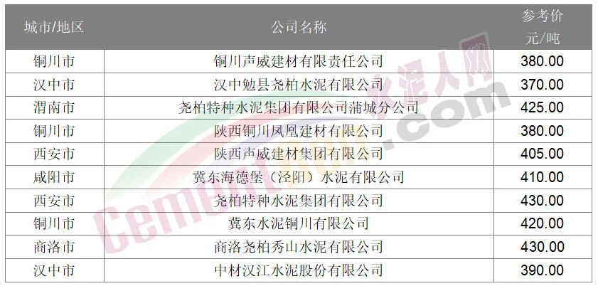 2月26日,陜西漢中地區(qū)堯柏水泥、中材水泥等主要品牌企業(yè)通知上調(diào)水泥價格30元/噸。