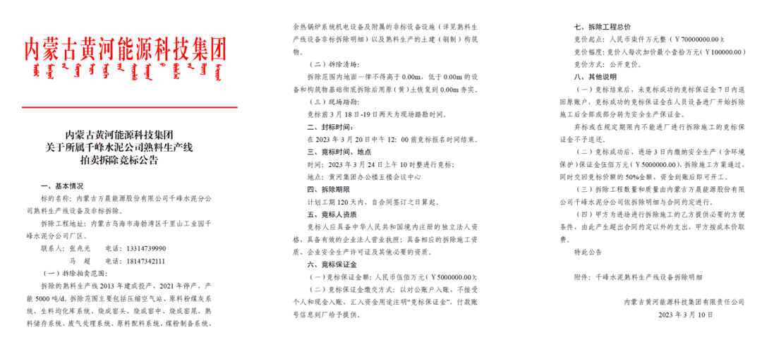 日前,內(nèi)蒙古黃河能源科技集團發(fā)布《關(guān)于所屬千峰水泥公司熟料生產(chǎn)線拍賣拆除競標(biāo)公告》公開內(nèi)蒙古萬晨能源股份有限公司千峰水泥分公司熟料生產(chǎn)線設(shè)備及非標(biāo)拆除。