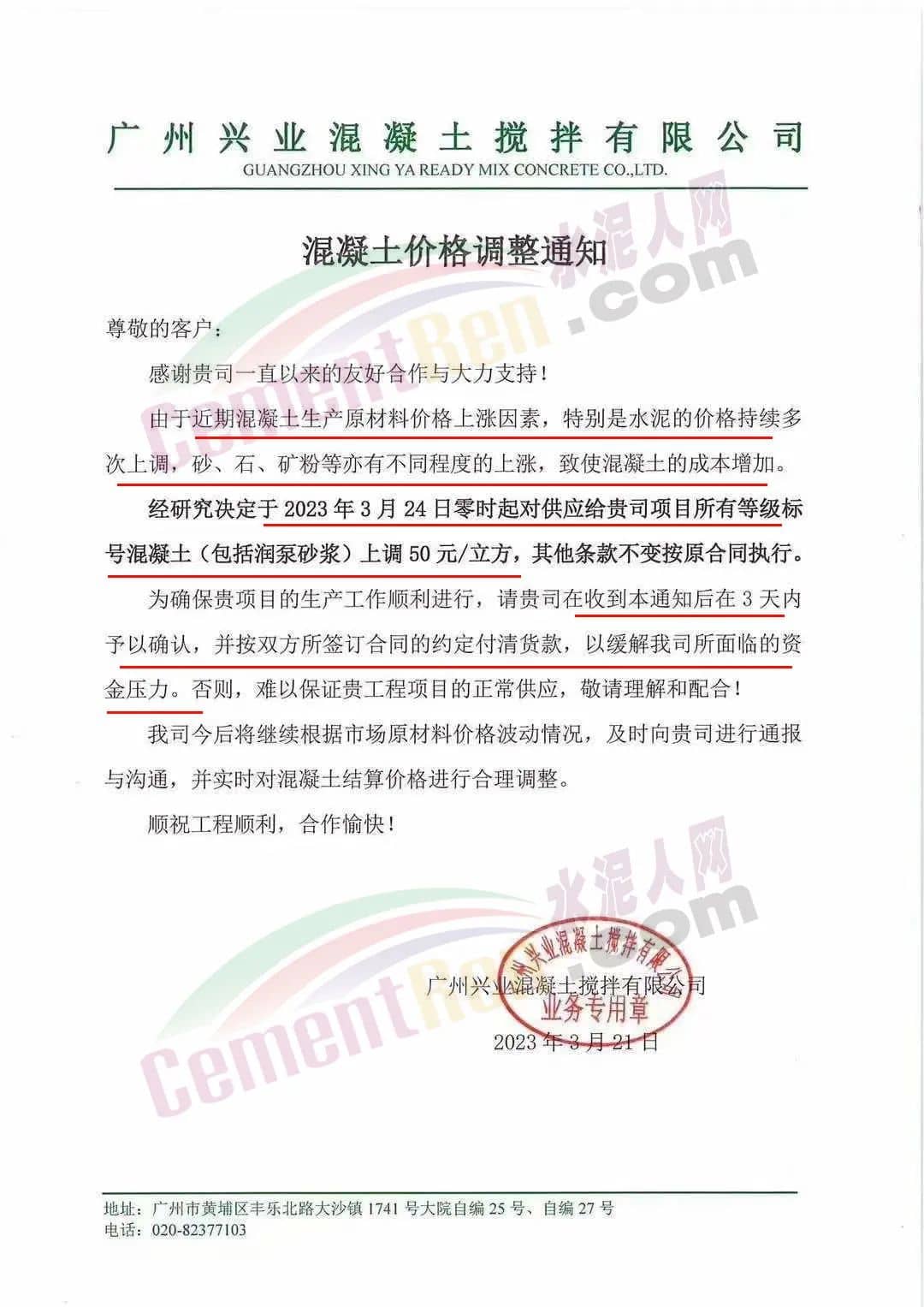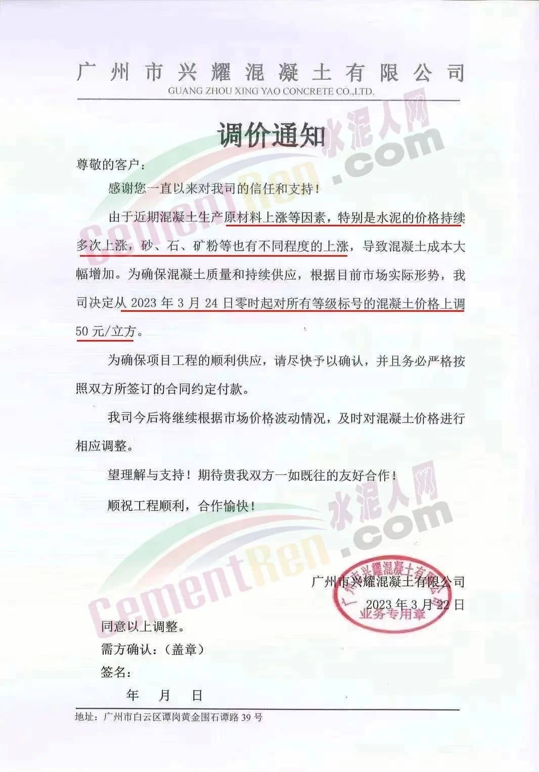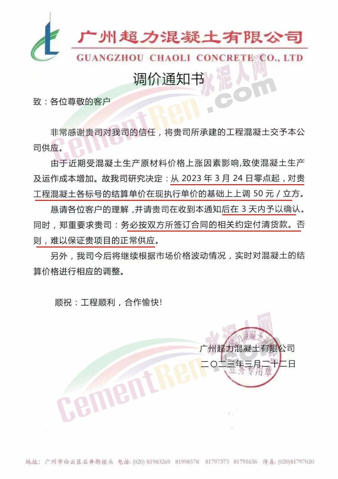 廣州市砼一混凝土有限公司通知由于近期原材料價格不斷大幅上漲,致使混凝土生產(chǎn)成本大幅度增加,為保證混凝土質(zhì)量和供應(yīng),經(jīng)公司研究后決定從2023年3月23日零時起,混凝土各標(biāo)號結(jié)算單價在現(xiàn)時執(zhí)行的單價基礎(chǔ)上上調(diào)50元/立方。為保證項目混凝土的及時供應(yīng),請客戶三天內(nèi)予以回復(fù)確認(rèn),并按照雙方所簽訂合同的約定付清貨款,以緩解公司所面臨的資金壓力,否則,難以保證工程項目的正常供應(yīng)。