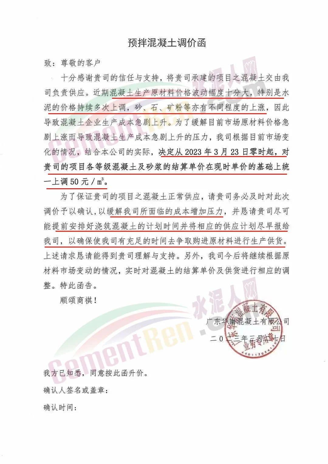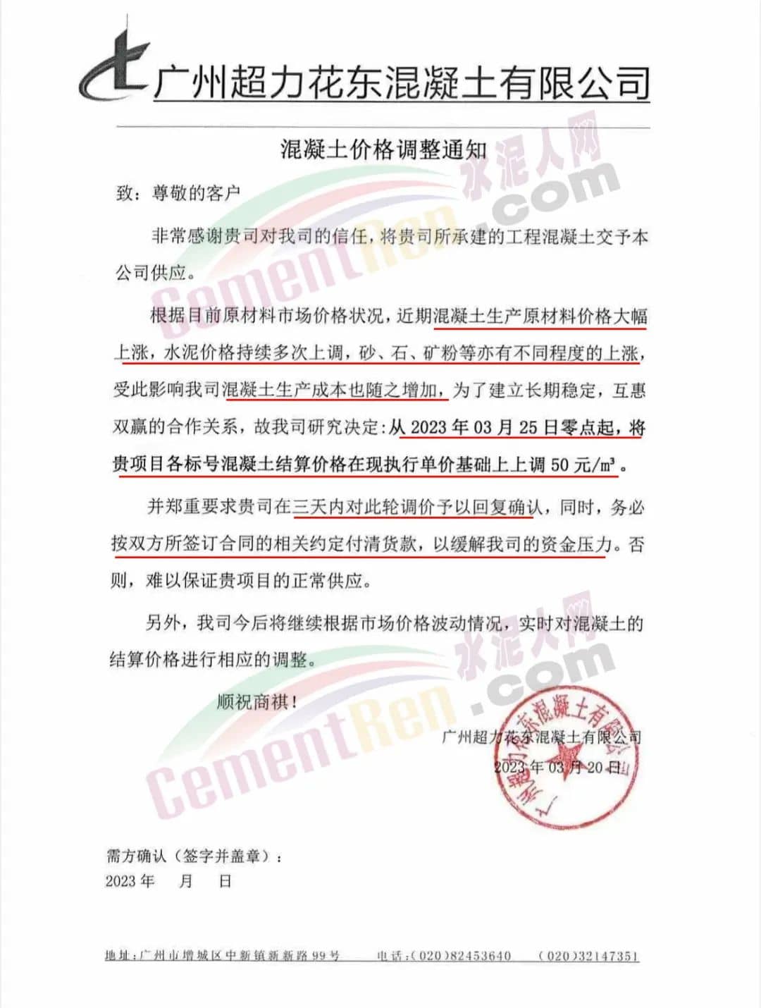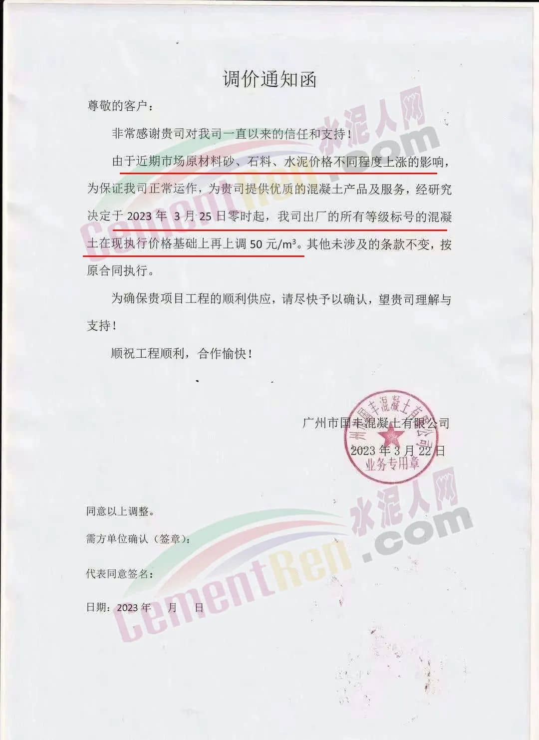廣州市砼一混凝土有限公司通知由于近期原材料價格不斷大幅上漲,致使混凝土生產(chǎn)成本大幅度增加,為保證混凝土質(zhì)量和供應(yīng),經(jīng)公司研究后決定從2023年3月23日零時起,混凝土各標(biāo)號結(jié)算單價在現(xiàn)時執(zhí)行的單價基礎(chǔ)上上調(diào)50元/立方。為保證項目混凝土的及時供應(yīng),請客戶三天內(nèi)予以回復(fù)確認(rèn),并按照雙方所簽訂合同的約定付清貨款,以緩解公司所面臨的資金壓力,否則,難以保證工程項目的正常供應(yīng)。