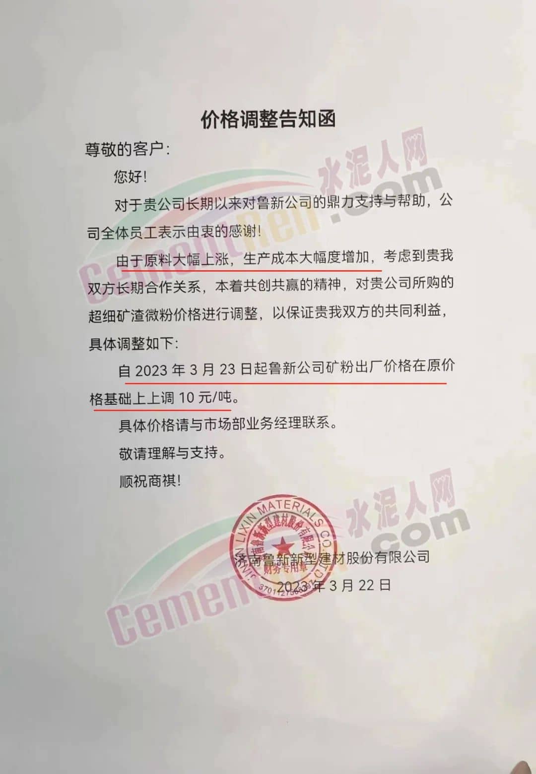 濟(jì)南魯新新型建材股份有限公司通知,由于原料大幅上漲,生產(chǎn)成本大幅度增加,自2023年3月23日起魯新公司礦粉出廠價格在原價格基礎(chǔ)上上調(diào)10元/噸。