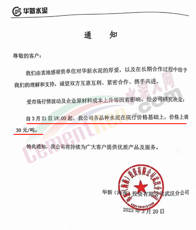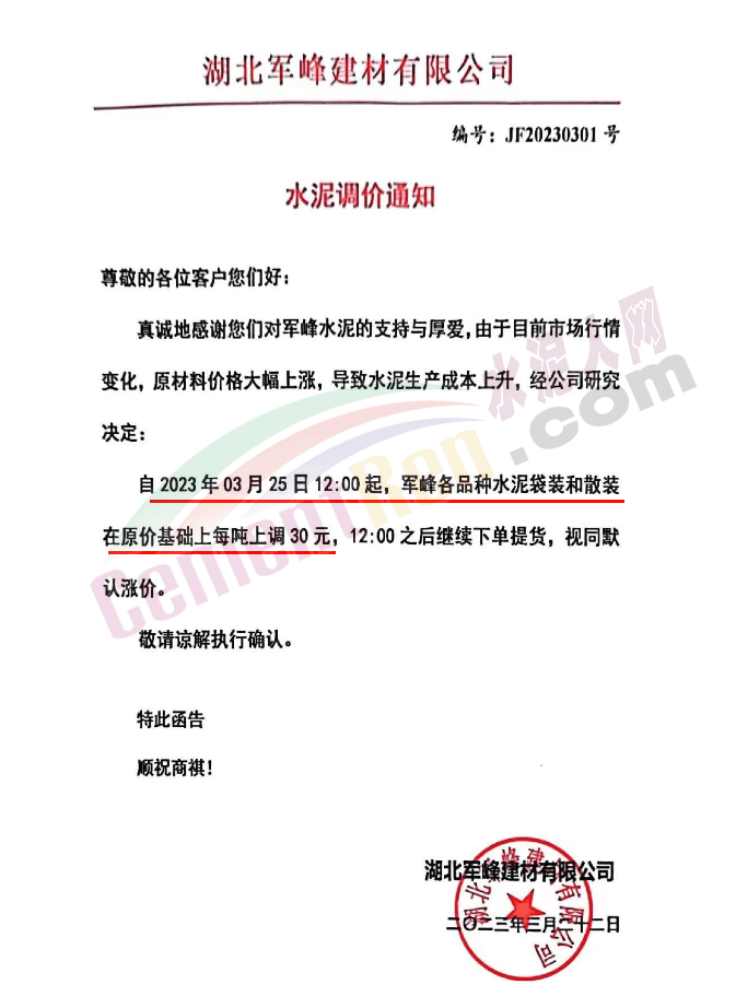 湖北軍峰建材有限公司通知,由于目前市場行情變化,原材料價格大幅上漲,導(dǎo)致水泥生產(chǎn)成本上升,經(jīng)公司研究決定自2023年3月25日12:00起,軍峰各品種水泥袋裝和散裝在原價基礎(chǔ)上每噸上調(diào)30元。